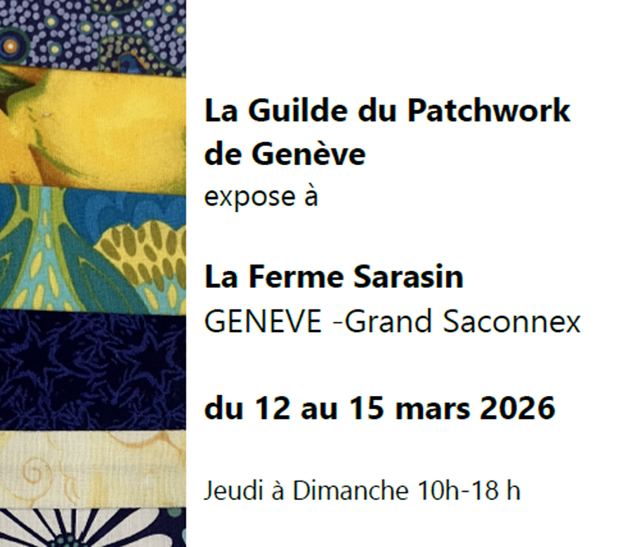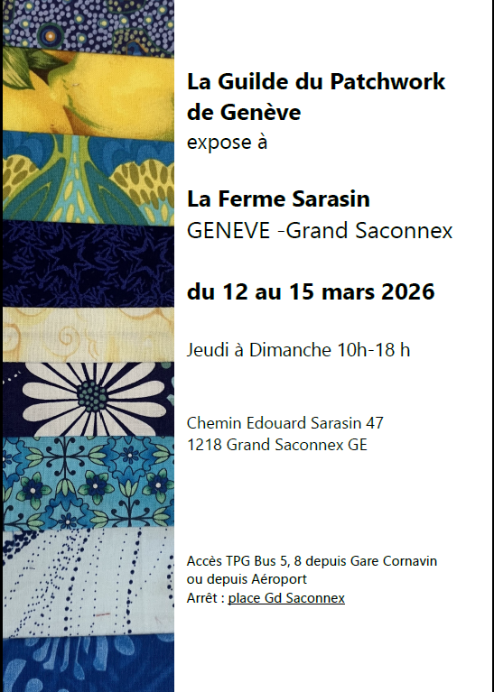 La Guilde de Patchwork de Genève a le plaisir de vous inviter à découvrir les réalisations de ses membres lors de son exposition , qui se tiendra du 12 au 15 mars à la Ferme Sarasin, au Grand-Saconnex.